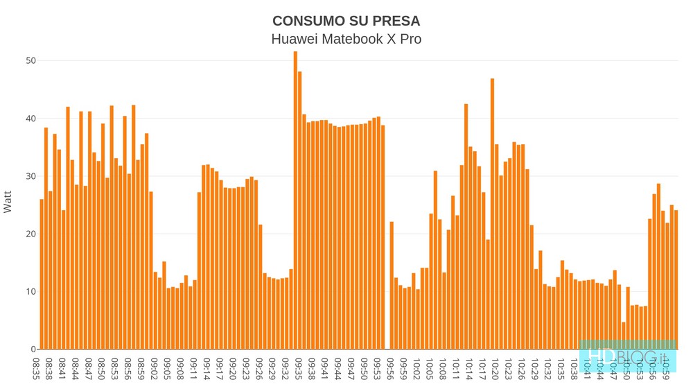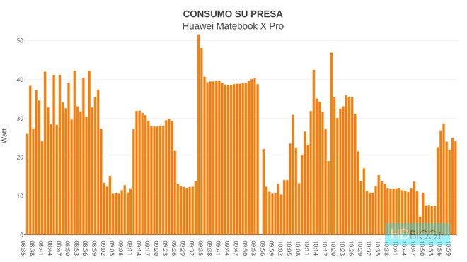 Per fortuna l'autonomia bilancia la sciocchezza del partizionamento. Una batteria da 57.4 Wh, la scheda grafica Intel ed il gestore energetico tirchio permettono a Matebook X Pro di superare le 10 ore di autonomia nella navigazione web con schermo al 50% (luminosità "consigliata" da Windows 10, con sensore attivato), almeno 8 tab su Chrome, Telegram Desktop e qualche movimento di file e cartelle da USB. È una durata che copre la giornata lavorativa. Sull'app Netflix a schermo intero si passano le 11 ore di autonomia, mentre uno stress test scarica il portatile del 67% ogni ora nonostante un logico calo delle prestazioni quando si lavora in questa modalità (vedi grafico poco sopra). Sono risultati migliori di un HP Spectre X360 13 4K, sul livello di Dell XPS 13 edizione Full HD - nonostante questo pannello abbia il 18% di pixel in più. Tutto dimostra un certo lavoro di ottimizzazione e nessuno spreco di risorse.