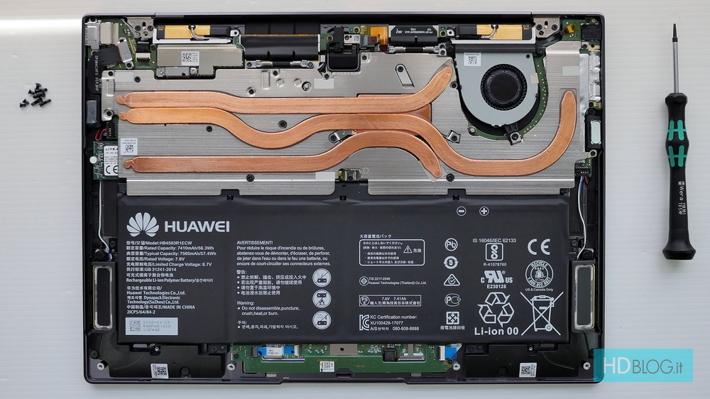 La ventolina gira alla sua massima frequenza (non darei per certi i valori RPM riportati da HWInfo perché mi sembrano esagerati; più utile guardare l'andamento nei grafici) ed il telaio esterno arriva ai 49°C sotto lo schermo. Le temperature di un Dell XPS 13 restano più basse, ma Matebook X Pro ha una sola ventola da 30 mm anziché due. Huawei ha scelto tre heatpipe e una piastra metallica per dissipare il calore. Riesce a farlo con un assemblaggio pulito e bello da vedere. Smontare il portatile è facile; richiuderlo è comodo grazie alle viti differenziate in altezza. Più noioso cambiare la SSD.