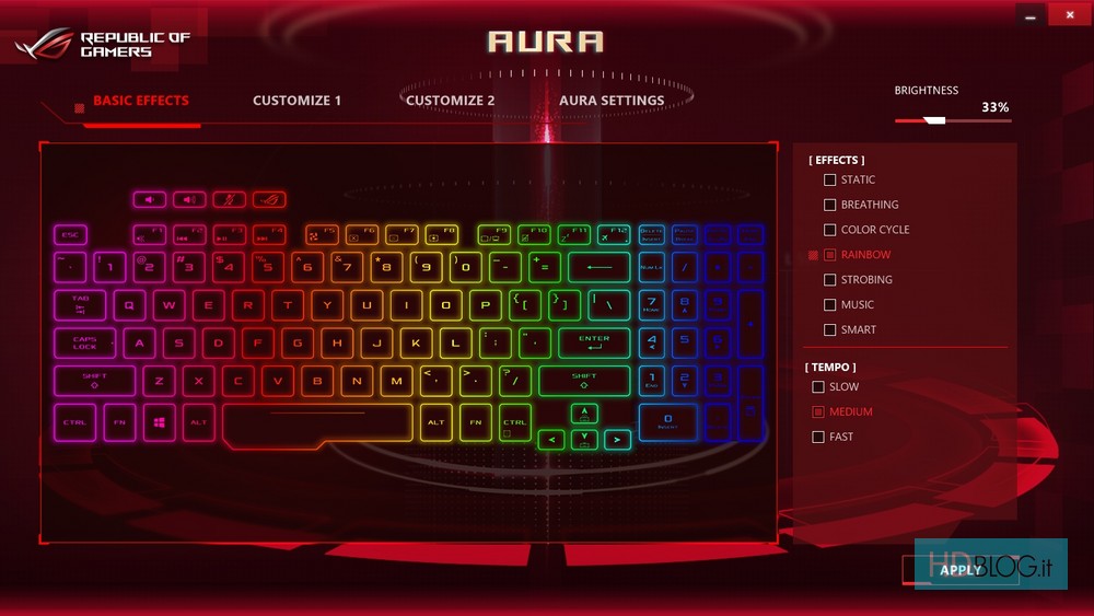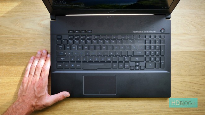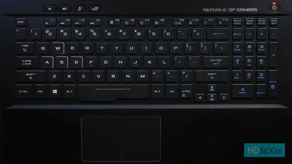 Al contrario, stato fatto un lavoro eccellente sulla tastiera. Corsa di 1.5 mm, 79 grammi per l'attuazione, keycaps personalizzati per certe zone (come la WASD, con tanto di pallino sopra la W), legende in maiuscoletto, e illuminazione Aura RGBa quattro zone con intensit regolabile, giochi di luce e personalizzazione software. La migliore concorrenza ha iniziato ad usare tastiere illuminate sotto ogni singolo tastonei suoi top di gamma (vedi MSI GS65 Stealth Thin) ma sono prodotti progettatimesi dopo questo Zephyrus M. E, comunque, qua c' la qualit di digitazione sufficiente a garantire sia una scrittura prolungata piacevole,sia la precisione necessaria aigiochi.