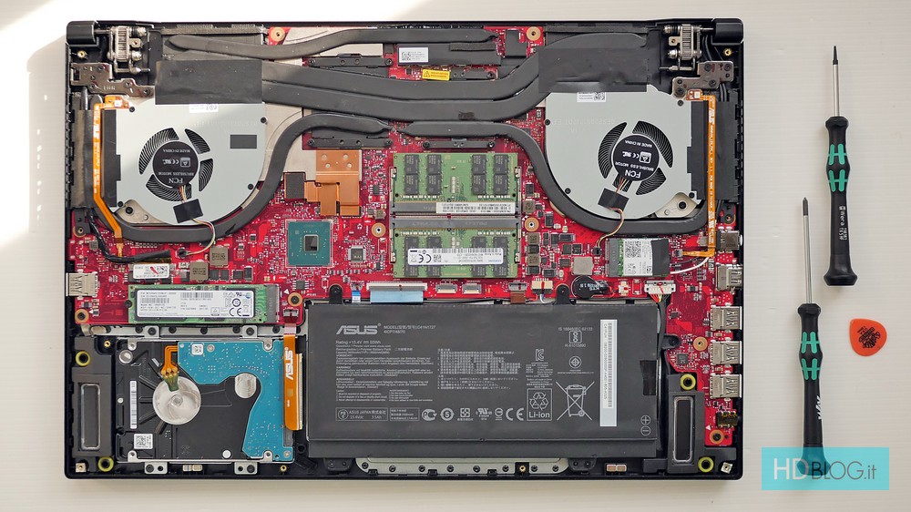 Zephyrus M supporta 32 GB di RAM DDR4-2666 MHz ed in venditacon due banchi Samsung da 8 o 16 GB. Le parti principali hanno spazio a sufficienza per essere rimossee pulitesenza difficolt ed una sorpresa notare quanto la scheda sia densa di componenti. L'immagine sotto fa capire perch le porte sono installate tanto in basso. A guardarlo cos, sembra che non ci sia altro modo per modificare la disposizione interna dello Zephyrus M. Una bella sfida per ASUS! Consiglio di notare anche lo spazio occupato dal disco meccanico di sinistra; alcuni avrebbero preferito una batteria pi grande anzich la memoria in pi. una considerazione su cui torneremo tra poco.