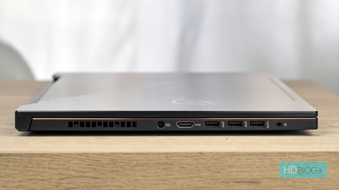 Zephyrus M integra quattroporte USB 3.1 Type-A e una HDMI 2.0 a grandezza standard, ma non ha un portaEthernet e non ha un lettore SD; inoltre il suojack audio da 3.5 mm combo, non separato. La mancanza di una RJ45 la discriminante maggiore su un portatile da gaming come questo: ASUS ha scelto la scheda wireless Intel pi moderna tra le disponibili al momento della produzione, ma i motivi che l'hanno portata a rinunciare allaGigabit Ethernetrestano difficili da tollerare. Possono essere spiegati dallo spazio aggiuntivo richiesto dal sistemaActive AerodynamicSystem (di fatto, non permette di installare porte sul retro e in prossimit delle cerniere - ne parleremo dopo) ma non tollerati. Serviva una soluzione diversa, anche un adattatore USB-Ethernet in confezione.
