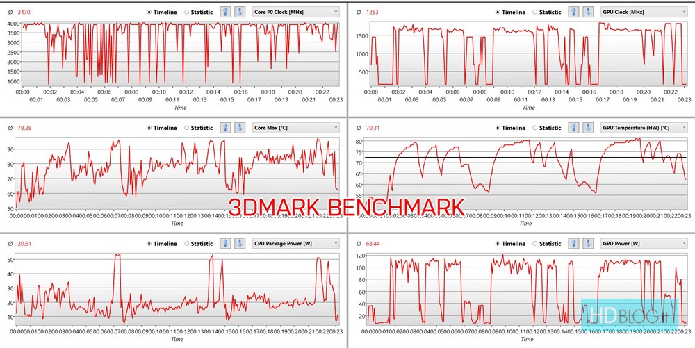 A guardare i grafici della suite3DMark e lo stress test alla CPU con Prime 95, si confermano gli stessi comportamenti. Nel benchmark grafico ogni cosa a suo posto: consumo sotto carico sopra i 100 watt, temperature "tagliate" sugli80 C (sopra questa soglia c' un vero blocco) e frequenza sopra 1.5 GHz per tutto il tempo necessario. Nel test al processore si passa dai 3.8 GHz di picco ai 3.2 GHz per 5 minuti fino ai 2.9 GHz successivi, con un sistema che cerca di restare attorno ad 80 C e un CPU Package Power che sfrutta i 70 watt iniziali(per circa 30 secondi) per poi stabilizzarsi sui classici 45 watt.