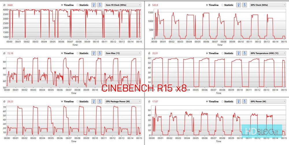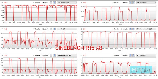 Il valore CPU sorprendenteperch molto migliore di quanto raggiunto dalla stessa CPU su MSI GS63, a dimostrazione della qualit dell'impianto di smaltimento del calore di ASUS. A dire il vero entra in gioco anche una diversa gestione delle ventole; le macchine moderne sono progettate per generare meno rumore possibile nei primi minuti di carico pesante, salvo poi rifarsi quando il lavoro diventa prolungato. Qui, all'ottavo run di Cinebench R15, lo Zephyrus M perde ogni inibizione e d piena potenza alle ventole abbassando la temperatura della CPU e, di conseguenza, la sua capacit di restare su frequenze elevate. Ecco il grafico.