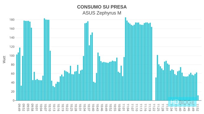 L'ultimo commento va all'autonomia, vero limite di ASUS Zephyrus M. Come abbiamo visto, labatteria una 55 Wh mentre il consumo pu salire parecchio quando la GPU Nvidia attiva; in uno dei graficiabbiamo anche fatto notare il calo di prestazioni quando si stacca l'alimentatore, cos come abbiamo lodato l'opzione Nvidia Optimus per il passaggio automatico tra GPU dedicata e GPU integrata. Per dire che non dovremmo aspettarci un'autonomia da Ultrabook, ma una via di mezzo. Le ultime generazioni di portatili da gaming hanno migliorato parecchio la loro durata, un po' per merito delle nuove tecnologie, un po' per la batterie sempre pi capienti (finalmente) inserite dai produttori. Questi laptop stanno diventando sempre pi adatti alla portabilit ed ha quindi senso curare anche questo aspetto.