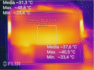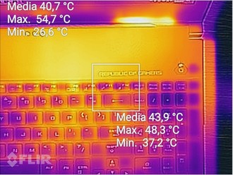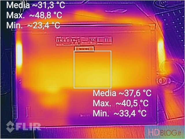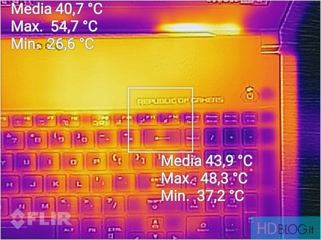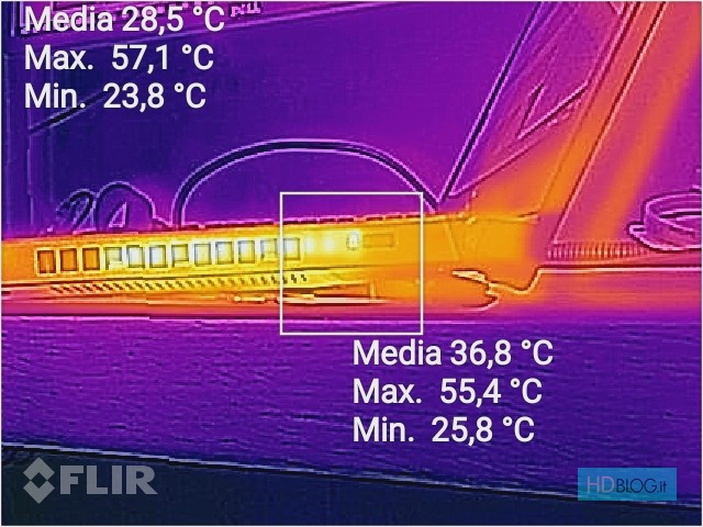 Zephyrus M GM501 un esempio riuscito di portatile equilibrato progettato da persone consapevoli. Nasce prima per il gaming e poi per stupire, e riesce a guadagnare i meriti di un obiettivo raggiunto. Il vincolo da accettare nella rumorosit delle ventole. ASUS tiene basse le temperature esterne e sotto controllo quelle interne (vedi foto termiche sotto) grazie a ventoline s migliori rispetto al passato, ma pur sempre capaci di coprire l'impianto audio nei giochi, nei rendering o in altre operazioni simili. Quando i sensori leggono dati che richiedono il massimo flusso d'aria, ecco che la rotazione di entrambe le ventole cresce al punto da richiedere, nei giochi, le cuffie. Nella valutazione bisogna sempre tener conto del telaioda 19 mm e della GPU 1070.