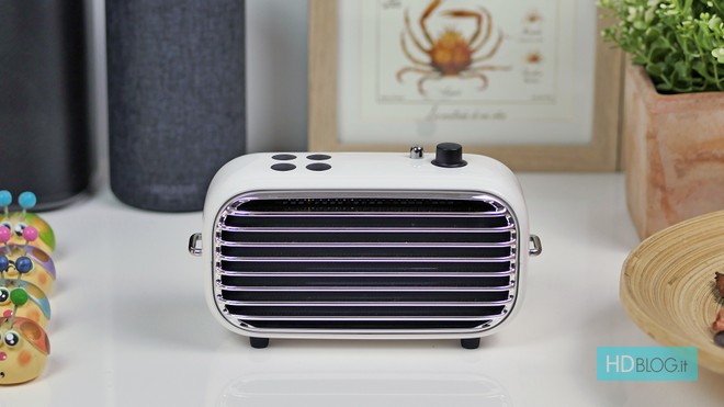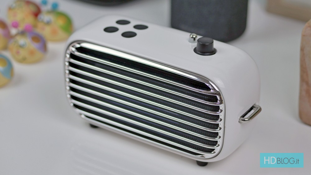 Al di là del suo aspetto adorabile, mi è piaciuta per come riesce a spingere fuori i bassi da ogni traccia in riproduzione. Quella grossa membrana scoperta che vi faccio vedere al rallentatore nel video, sfrutta la cassa di risonanza interna per gonfiare il suono molto più degli altri altoparlanti portatili a cui sono abituato; e ne ho provati di prodotti validi in questi anni. Parlo di frequenze basse, probabilmente vicine ai 60 Hz dichiarati dal produttore. Anche a volume modesto, Lofree Poison vibra e scalcia, quasi balla sui piedini in gomma; medi e alti escono solo dai due driver frontali (52 mm, 4 Ohm ciascuno), e questo è un po' il limite di un design vecchio stile, non spaziale, del tutto diverso da prodotti come Apple HomePod e Google Home.