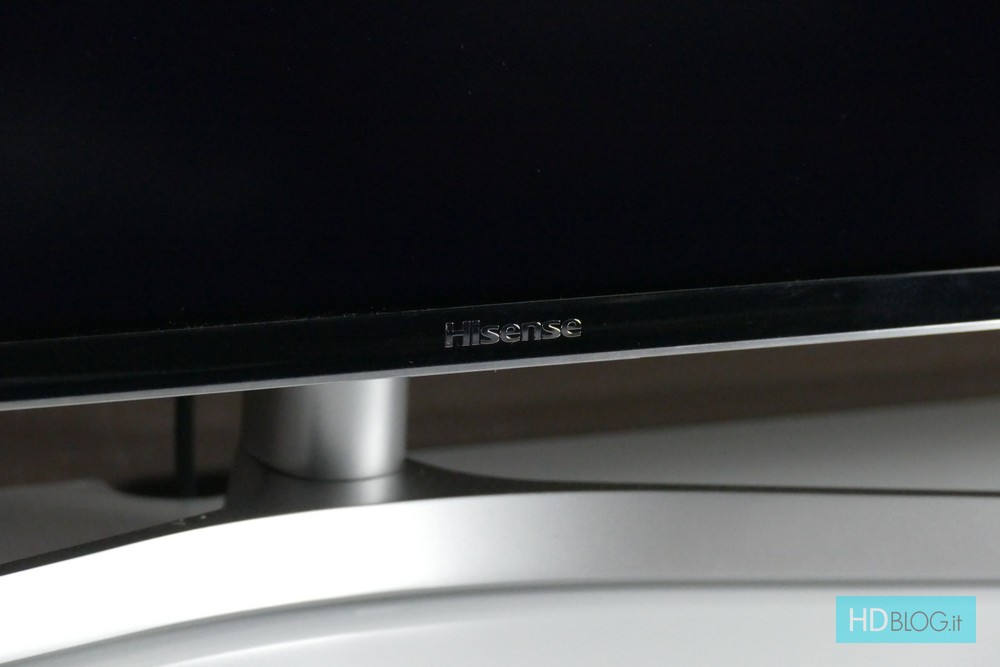 Il lato inferiore è invece un po' più sviluppato: al centro è collocato il logo "Hisense" mentre a sinistra, subito sotto la serigrafia "ON/OFF", troviamo il tasto per accendere o spegnere fisicamente l'apparecchio. Anche lo sviluppo in profondità è molto contenuto, specialmente nella prima metà del TV. La metà inferiore, come di consueto, è infatti più spessa per accogliere elettronica, connettori e la sezione audio. Quest'ultima utilizza un posizionamento inusuale (anche se non inedito) degli altoparlanti. Sono collocati sul retro e in basso, ai lati del piedistallo.