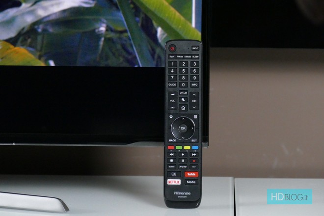 Il telecomando è un'unità piuttosto convenzionale. Nella parte superiore troviamo i tasti numerici, il controllo del volume e il cambio del canale e tutti gli altri pulsanti di uso comune. Nella parte centrale sono invece collocati la croce direzionale, il tasto OK e quelli per accedere ai menu principali. Nella parte bassa sono stati inseriti i controlli multimediali e l'accesso alla Smart TV, al media-player, a Netflix e YouTube. L'ergonomia è piuttosto buona e anche la risposta dei tasti alla pressione è soddisfacente. L'unica critica che ci sentiamo di muovere, per quanto marginale, riguarda il "click" associato ad ogni pressione, potenzialmente fastidioso (poiché ben udibile) quando si immettono lunghe sequenze di comandi.
