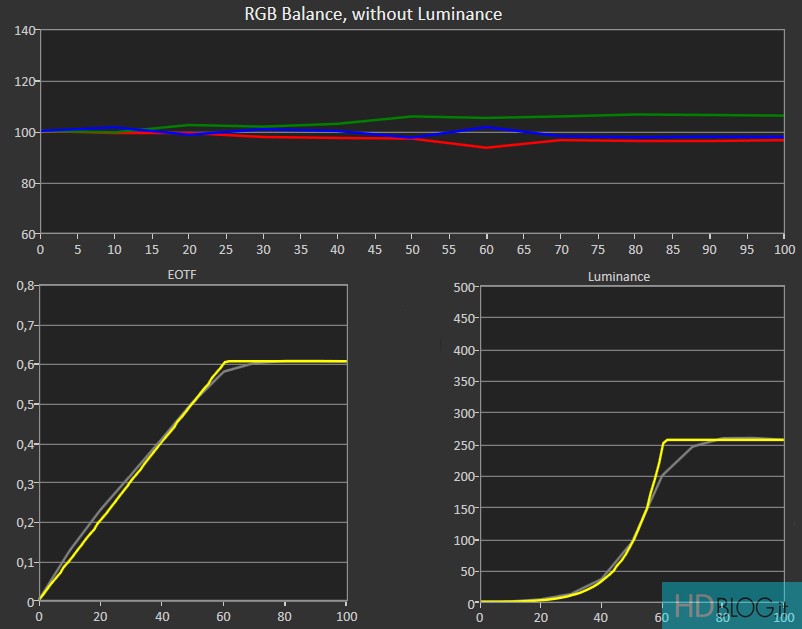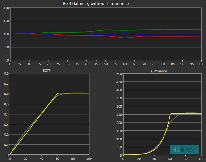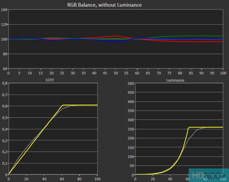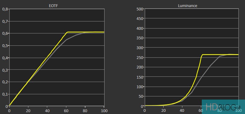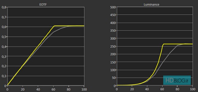 In HDR la taratura di fabbrica è più che discreta. Il bilanciamento del bianco evidenzia principalmente un eccesso di verde (che diviene più accentuato mano a mano che ci si avvicina al bianco al 100%) e una leggera mancanza di rosso. La curva EOTF (Electro-Optical Transfer Function), che ritrae la precisione nel rappresentare l'equilibrio ideale tra chiari e scuri, varia in funzione della modalità scelta. HDR Notte e Giorno evidenziano infatti tendenze differenti. La modalità Notte è più rigorosa ma tende anche a scurire le immagini per preservare tutti i dettagli.