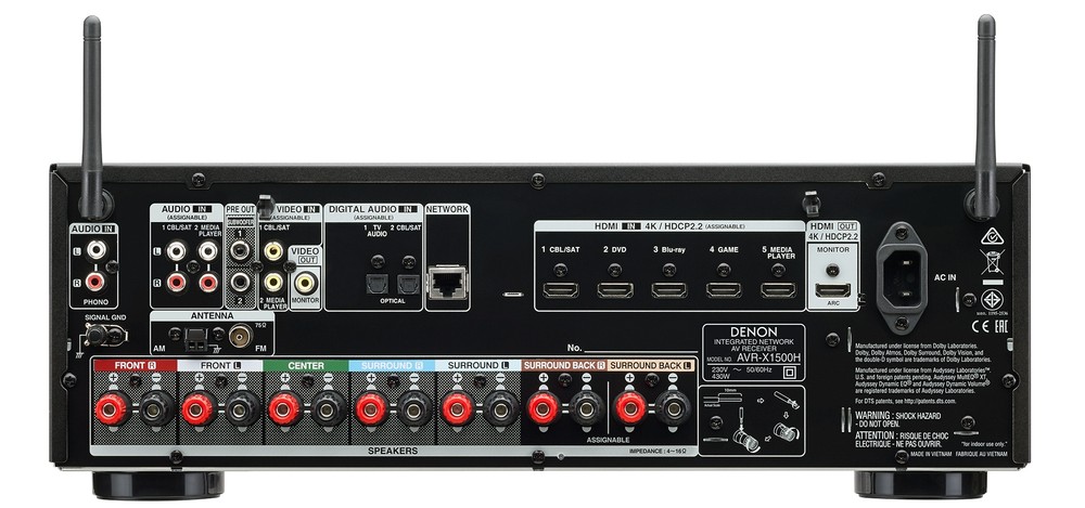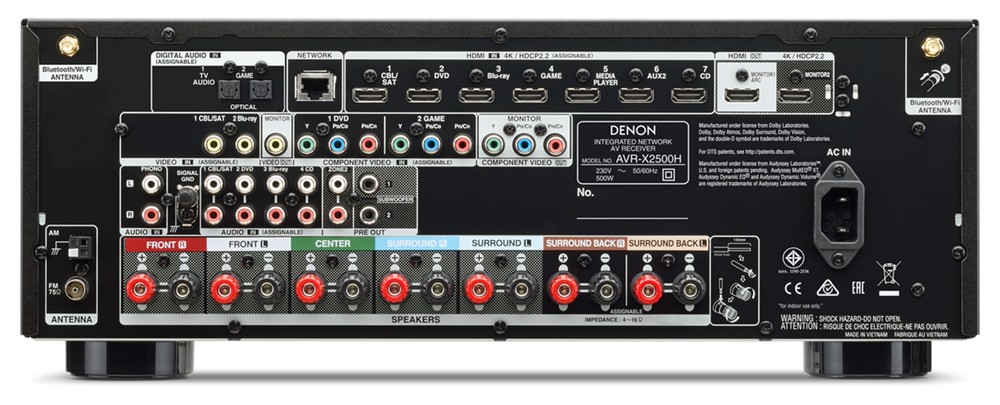 Da USB e rete locale si possono riprodurre file audio MP3, WMA, FLAC, AAC, WAV, AIFF e DSD fino a 5,6MHz. La calibrazione automatica è affidata al sistema Audyssey MultEQ XT con Audyssey Dynamic Volume e Dynamic EQ. AVR-X2500H dispone anche di un processore video Analog Devices che permette di eseguire l'upscaling di tutte le sorgenti fino alla risoluzione Ultra HD.