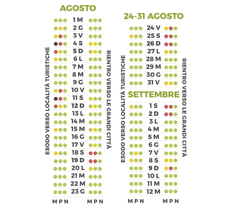 Saranno questi i giorni da evitare causa traffico nella rete autostradale, con rallentamenti dovuti al solito esodo verso le località turistiche che porterà moltissimi automobilisti sulla rete italiana. Sia il 4 che l'11 agosto il traffico autostradale migliorerà leggermente nel pomeriggio, portando il livello d'allerta a "bollino rosso", normalizzando poi la situazione la notte con il verde.