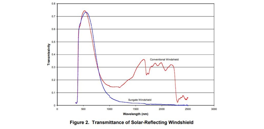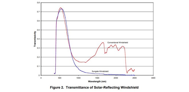 Sono stati testati diversi parabrezza e il più efficace pare sia un nuovo modello della Sungate, realizzato a più strati e con un sottile rivestimento tra quello esterno e quello interno capace di riflettere le radiazioni infrarosse. Questo infinitesimo interstizio è elettricamente conduttivo, può esser utilizzato come antenna della radio e sfruttato per sbrinare anche il vetro nelle giornate più fredde. Di seguito una tabella che mostra la differente trasmissività tra il modello Sungate ed uno convenzionale (della Solex), con il primo che ottiene un impatto minore del sole del 27%.
