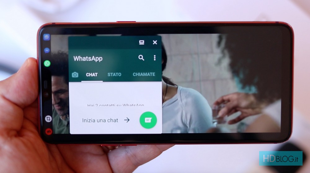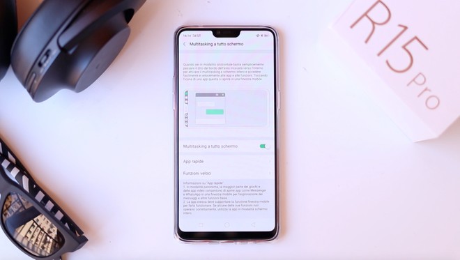 La funzione Full Screen Multitasking consente di sovrapporre una seconda applicazione in finestra ad una messa a schermo intero. Per aprire la seconda applicazione, che possiamo liberamente muovere sul display, basta effettuare uno scorrimento del dito dai lati del notch.