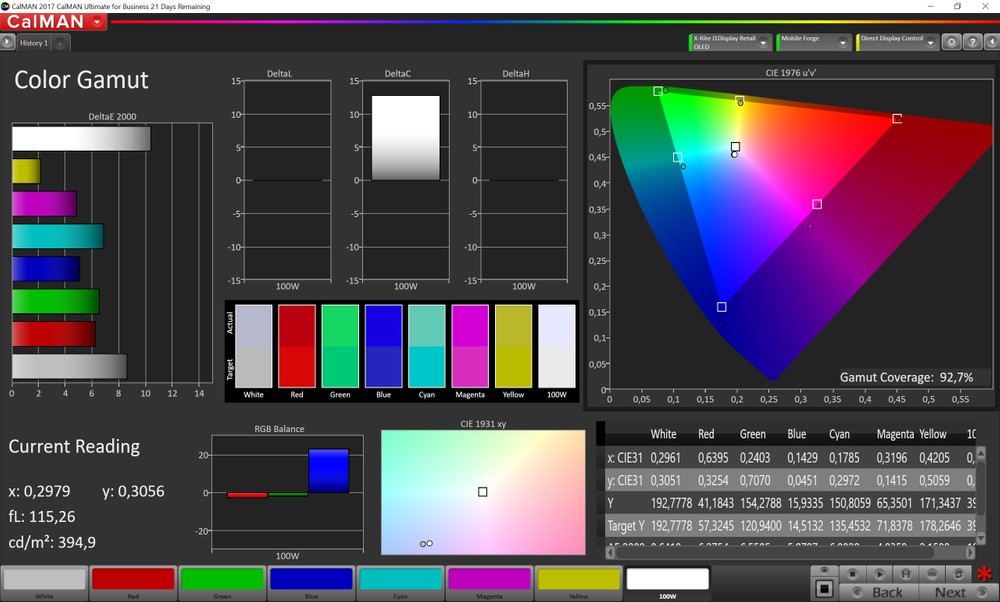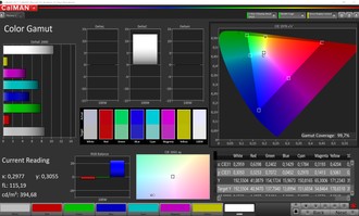 L'analisi del display con Calman ha rilavato una copertura sRGB del 99.7% ed AdobeRGB del 92.7%. Leggermente elevati i valori del DeltaE relativo ai colori ed al grigio, rispettivamente 5.5% e 6.8%.