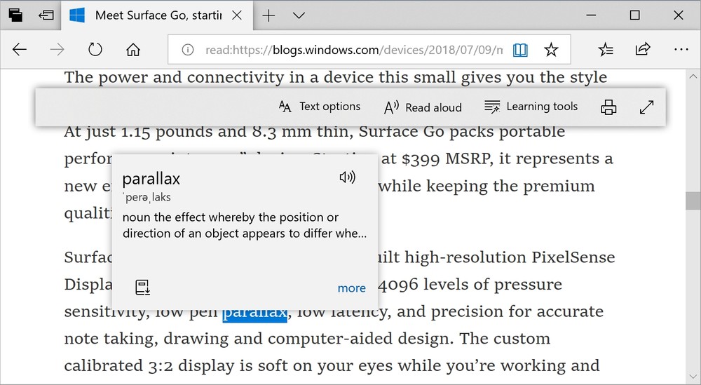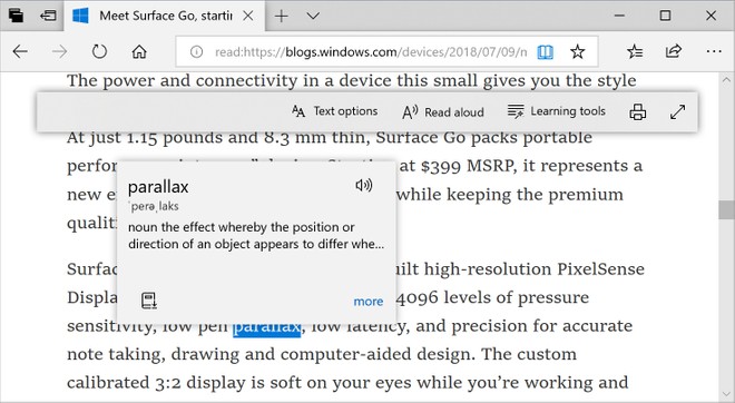 - Possibilità di cercare in un dizionario integrato le definizioni delle parole quando si è in modalità lettura, libri e PDF. È possibile anche farsi leggere ad alta voce la parola.