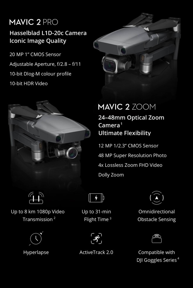 Mavic Pro 2 è ovviamente migliorato esteticamente e offre una maggiore qualità video con una lente in grado di catturare molta più luce e registrare video in 4K a 30fps. Il peso è di 907 grammi e raggiunge una velocità massima di 72 km/h. Non manca il sistema di trasmissione OcuSync 2.0 a 2.4 e 5.8 GHz che garantisce un video di ritorno a 1080p anche su lunghe distanze in modo da sfriuttare i 31 minuti di autonomia.