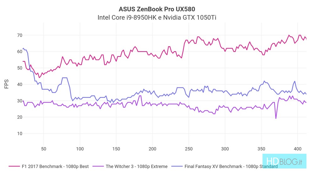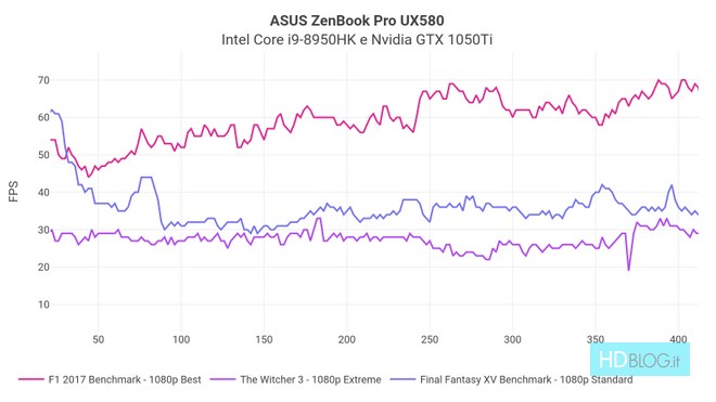 Infine, un grafico relativo ai giochi. F1 2017, The Witcher 3 e Final Fantasy XV in 1080p, sono perfettamente giocabili anche a dettagli medio alti. Solo Final Fantasy XV è stato eseguito in modalità "Stardard". Nei benchmark, la GTX 1050 Ti ha dei risultati peggiori del previsto (vedi tabella in alto) ma regge il test dei giochi. Non è presente nel grafico a seguire, ma anche F1 2018 con dettagli al massimo (modalità Benchmark) resta sopra i 50 fps. ZenBook Pro UX580 non è un portatile specifico per il gaming ma accontenta il genere di utente interessato ad una macchina polivalente.