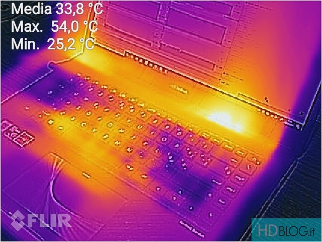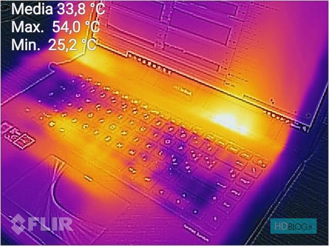 Durante gli stress test di cui parleremo tra un attimo, ma anche dopo qualche minuto di F1 2018 o The Witcher 3, la zona centrale della tastiera arriva a 55°C mentre il picco più alto, dove le cerniere, sfiora i 60°C. Bene il tastierino numerico e parte dei tasti WASD, ma non si può parlare di un notebook freddo quando è sotto carico. Il fondo del notebook resta sotto i 50°C. Le ventole si fanno sentire quando sono a pieno regime, ma come potrebbe essere diversamente? Non siamo al livello dei notebook da gaming quindi è credibile lanciare un rendering in un luogo pubblico (ma anche nella stessa stanza dove altri stanno dormendo) o giocare senza cuffie