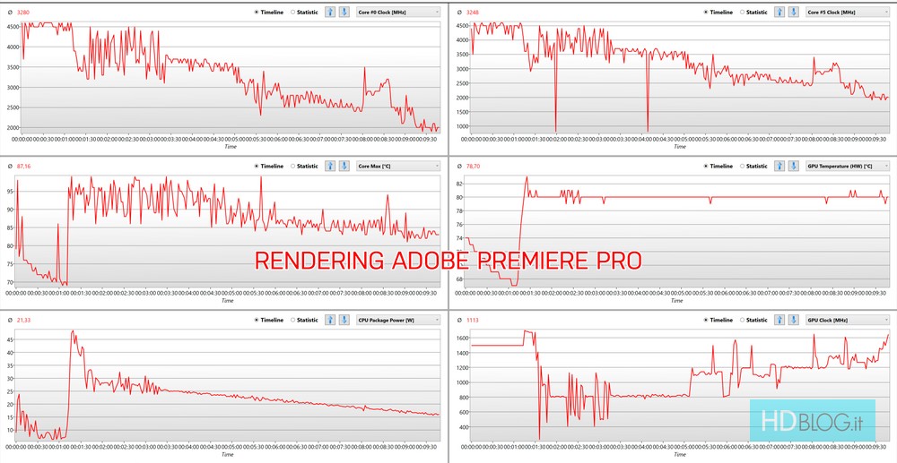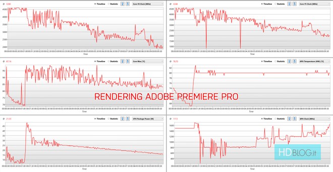 A dire il vero non è la migliore neanche per le prestazioni. E questa è la parte sostanziale della recensione. Il processore Core i9 non arriva mai al throttling termico penalizzante ma non riesce nemmeno a sfruttare le frequenze che dovrebbero garantire un certo vantaggio rispetto al migliore dei Core i7. Temperature vicine ai 100°C attivano i limiti dopo 3-4 secondi di picco, e poi bastano pochi minuti per vedere scendere anche quelle frequenze operative che ci aspettiamo più stabili. Guardate, ad esempio, il grafico generato dal rendering con Adobe Premiere Pro CC della recensione a Dead Cells per Nintendo Switch.