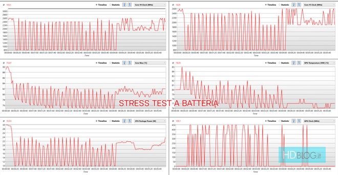 Si hanno i risultati migliori quando CPU e GPU si alternano. L'analisi dei benchmark di 3DMark e, soprattutto, della ripetizione di Cinebench R15. Nel primo caso, per quanto la CPU sia penalizzata nella distribuzione dei watt, resta sui 4.5 GHz in multi-core per tutti i 20 minuti di test. Benissimo la GPU a 1.6 GHz, con un leggero calo dopo 17 minuti dovuto ad una temperatura vincolata sugli 80°C. Su Cinebench R15 si ha una frequenza di 4.2 - 4.4 GHz per tutti i 10 run, con la GPU ancora sopra 1.6 GHz. In questo grafico si nota il taglio sulle temperature: 95°C per la CPU e 80°C per la GPU Nvidia.