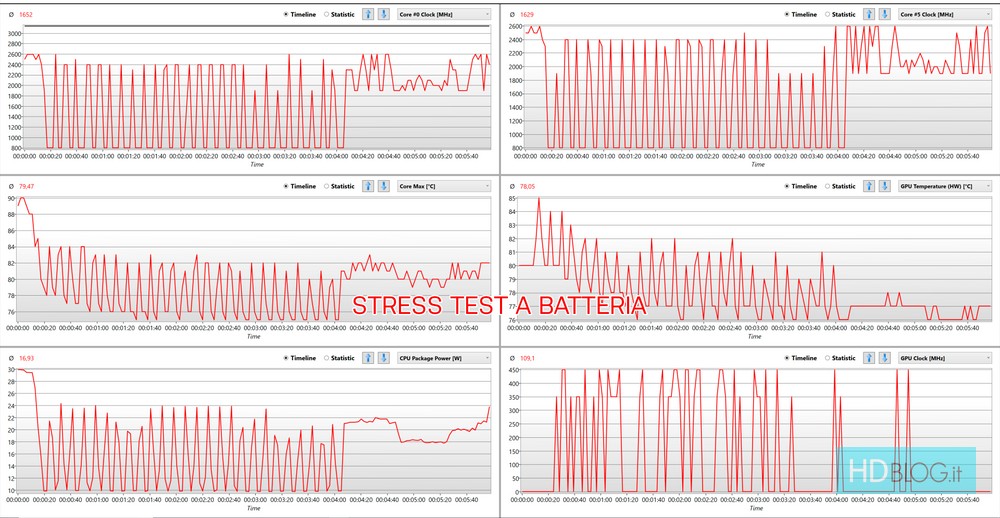Da notare anche come sia normale che la temperatura media si stabilizzi con il passare del tempo. I portatili di ultima generazione come questo sono progettati per usare poco le ventole nei primi minuti di carico; non le spingono mai al massimo per migliorare l'esperienza utente.