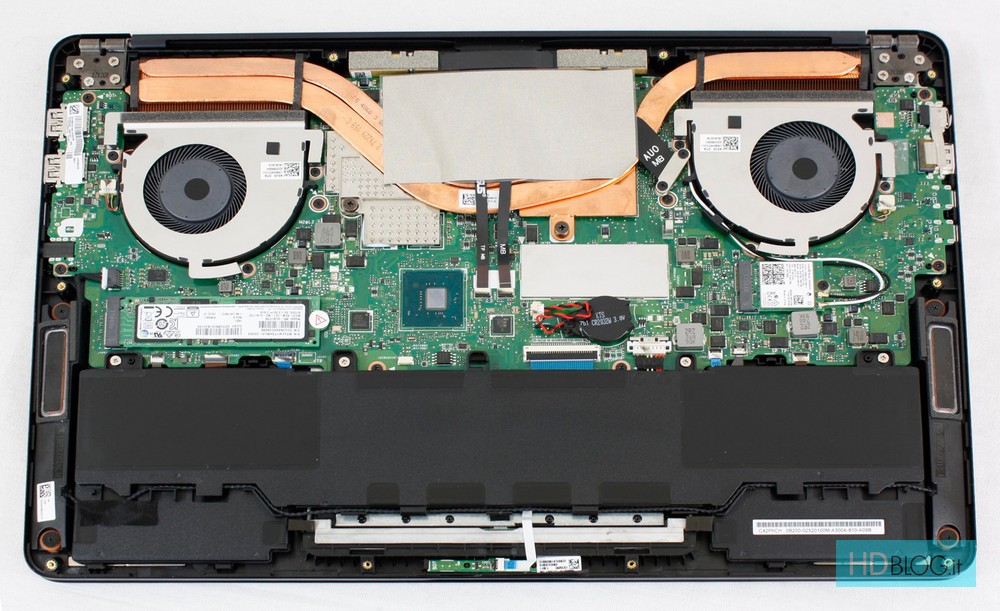 Le possibilità di aggiornamento hardware sono limitate al modulo SSD PCI-E (M.2 2280 Toshiba) e alla scheda wireless Intel 9560 per Wi-Fi ac a 1.7 Gbps e Bluetooth 5.0 - vero potenziamento rispetto allo scorso anno. La RAM DDR4 è saldata. Limpianto di smaltimento del calore usa due ventole da 50 mm a soffiare fuori il calore generato da CPU/GPU e trasportato da due heatpipes. Cè una sola via di fuga, ed è quella sotto la cerniera: i lati e il fondo del portatile non hanno griglie di ventilazione, quindi è consigliato lasciare sempre un po di spazio sul retro quando si fa del lavoro pesante. Anche perché le temperature di un Core i9 a piena potenza non sono trascurabili.