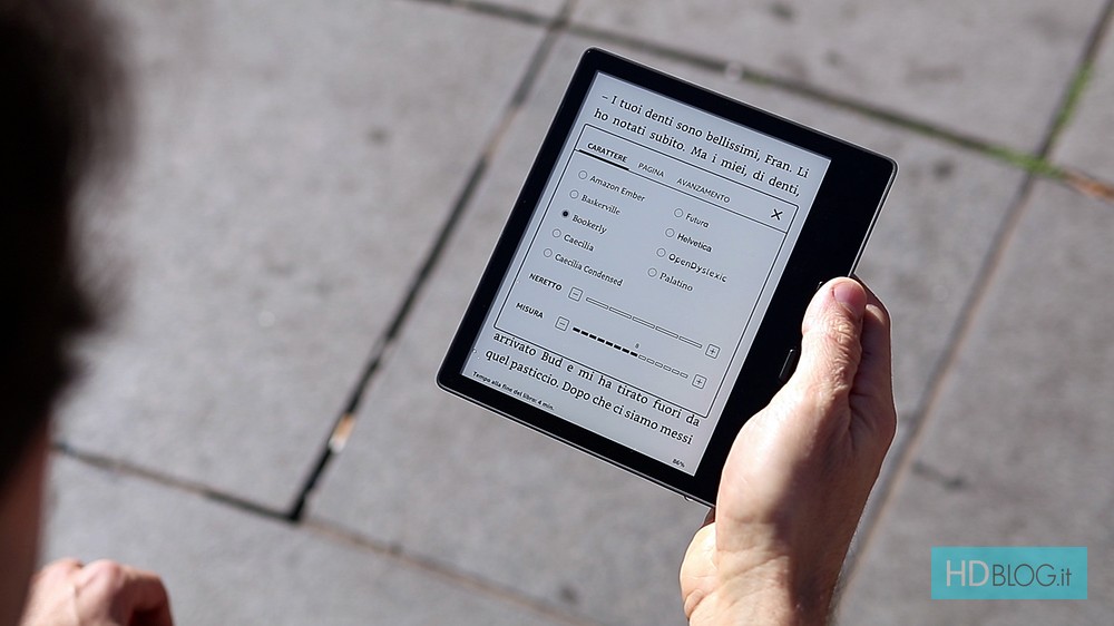 Il telaio di Kindle Oasis facilita la presa con una sola mano. Vuole imitare l'ergonomia di un libro piegato (o di una rivista piegata) e segue l'idea lanciata più volte negli anni da produttori di tablet come Lenovo e Sony. Un giroscopio interno ruota lo schermo da una parte o dall'altra per cambiare mano senza ripercussioni sull'esperienza di lettura. È un approccio naturale in tutti quei contesti dove è più comodo tenere il lettore con una mano (quando si legge in piedi, in fila alle Poste, mentre aspettiamo la metro o l'autobus) ma penalizza le situazioni in cui si vorrebbe reggere il telaio con due mani (a letto, da sdraiati).