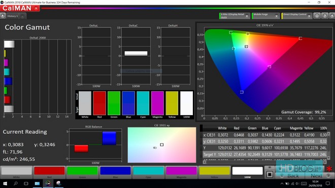 L'analisi del display ha rilevato ottimi valori anche per quanto riguarda il deltaE sui colori e sui grigi che si attestano, rispettivamente, su 2.29 e 2.4. La copertura sRGB è del 99.2%. Nessun problema per quanto riguarda la vista con lenti da sole polarizzate, anche ruotandolo.
