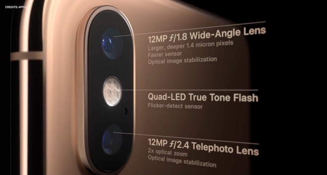 Il sensore principale ha un'apertura f/1.8, pixel da 1.4 micron e lente grandangolare. Il secondo sensore, sempre da 12 megapixel, ha un'apertura f/2.4 e lente teleobiettivo. Entrambi i sensori hanno stabilizzazione ottica. Il flash è un True Tone con 4 LED.