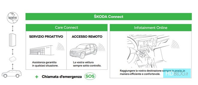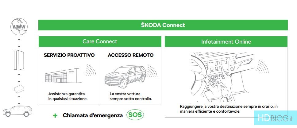 Iniziamo col dire che Skoda Connect si sviluppa su due diverse linee di servizi di connettività, Care Connect e Infotainment Online. Care Connect è la linea di servizi pensata per viaggiare connessi e tranquilli, suddivisa a sua volta in due aree operative: Service Proattivo, dedicato alla cura del veicolo e alla sicurezza, e Accesso remoto.