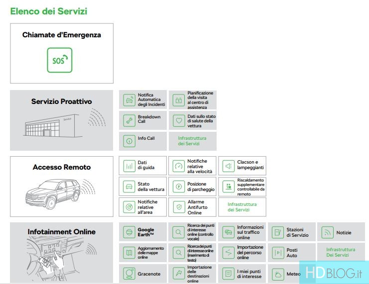 I servizi di Accesso Remoto - inclusi per il primo anno o i primi tre anni dall'acquisto, poi a pagamento - indica invece la possibilità di controllare alcune funzioni del veicolo direttamente dall'applicazione per smartphone Skoda Connect.