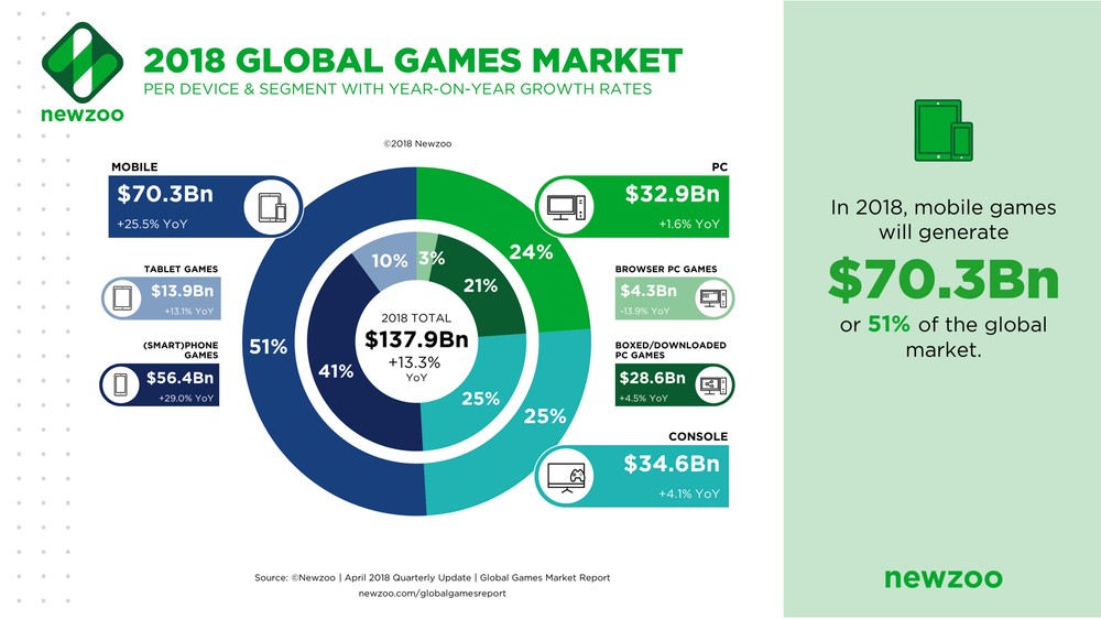 Il gaming mobile non piace a nessuno ma tutti ci giocano: nel 2018 il 51% dei ricavi dell’intera industria del videogioco proverrà dalle piattaforme mobili, mentre console e PC si divideranno - in maniera quasi uguale - il restante 49% dei ricavi.