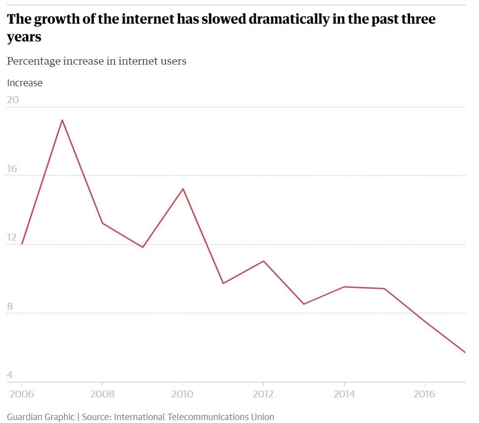 Il ritmo con cui si diffonde l'accesso a Internet nel mondo ha subito un notevole rallentamento: in dieci anni, dal 2007 al 2017, il tasso di crescita dell'accesso a Internet a livello globale ha perso più di dieci punti percentuali, passando dal 19% a meno del 6%; il tutto nonostante in Cina si sia arrivati alla cifra record di 800 milioni di persone connesse. A lanciare l'allarme, suggerendo come la rivoluzione digitale - che sembrava ormai una certezza - potrebbe rimanere solo un miraggio per miliardi di persone che vivono nelle aree più povere e isolate del mondo, è stato The Guardian.