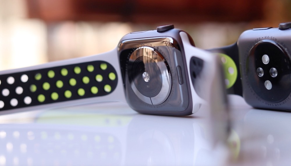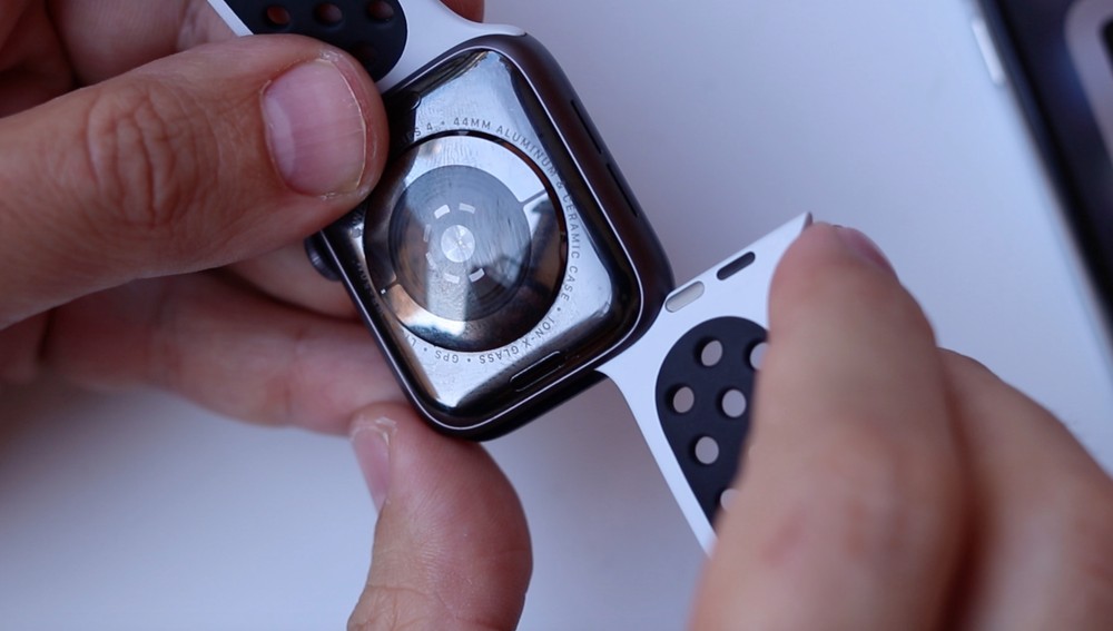 Anche il fondo di Apple Watch Series 4 è tutto nuovo. A differenza dei modelli precedenti, infatti, la cassa non è più un singolo blocco in metallo ma c'è un inserto in ceramica nera che consente di avere una migliore ricezione. La parte centrale con il cardiforquenzimetro è invece in vetro, non più in plastica come sul Series 3 in alluminio.