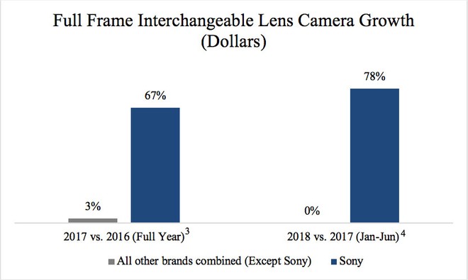 A cavalcare tale accelerazione nel migliore dei modi è stata di certo Sony, capace di sviluppare una line-up invidiabile di mirrorless e arrivare molto prima di altri alle full frame. Un percorso che paga e vale per la casa giapponese il primato in alcuni mercati chiave come quello statunitense, con una crescita impressionante del fatturato nella categoria "full frame Interchangeable Lens Camera" (che include quindi mirrorless e DSLR): +67% nel 2017 e +78% nella prima metà 2018.