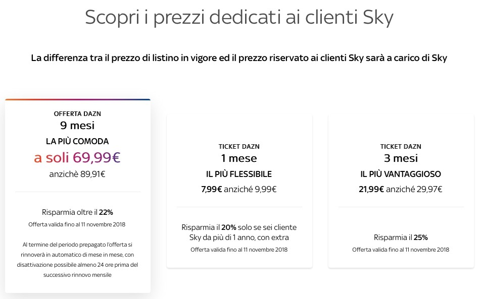 - Ticket DAZN 9 mesi - 59,99 Euro per l'intera stagione con uno sconto di 30 Euro sul prezzo di listino. Può essere acquistato da tutti i clienti Sky.