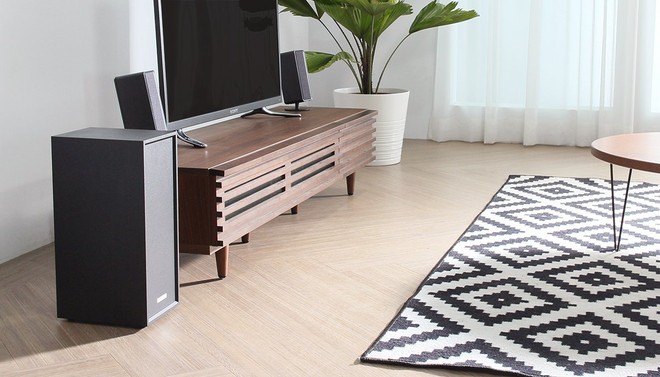 Il sub è invece in legno, anche questo piuttosto piccolo di dimensioni e quindi facile da collocare anche in ambienti non particolarmente ampi. Esteticamente liscio, pulito, minimale, nella parte posteriore ha il tasto connect, tpe-C e ingresso alimentazione.